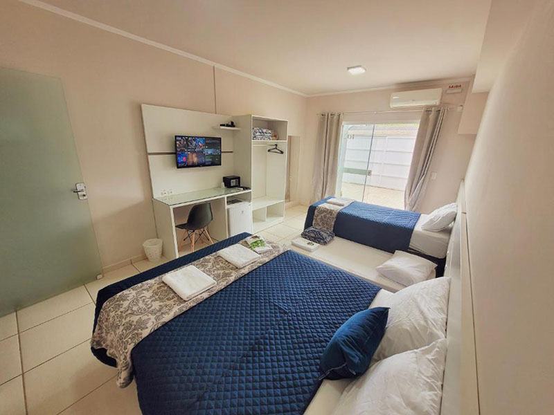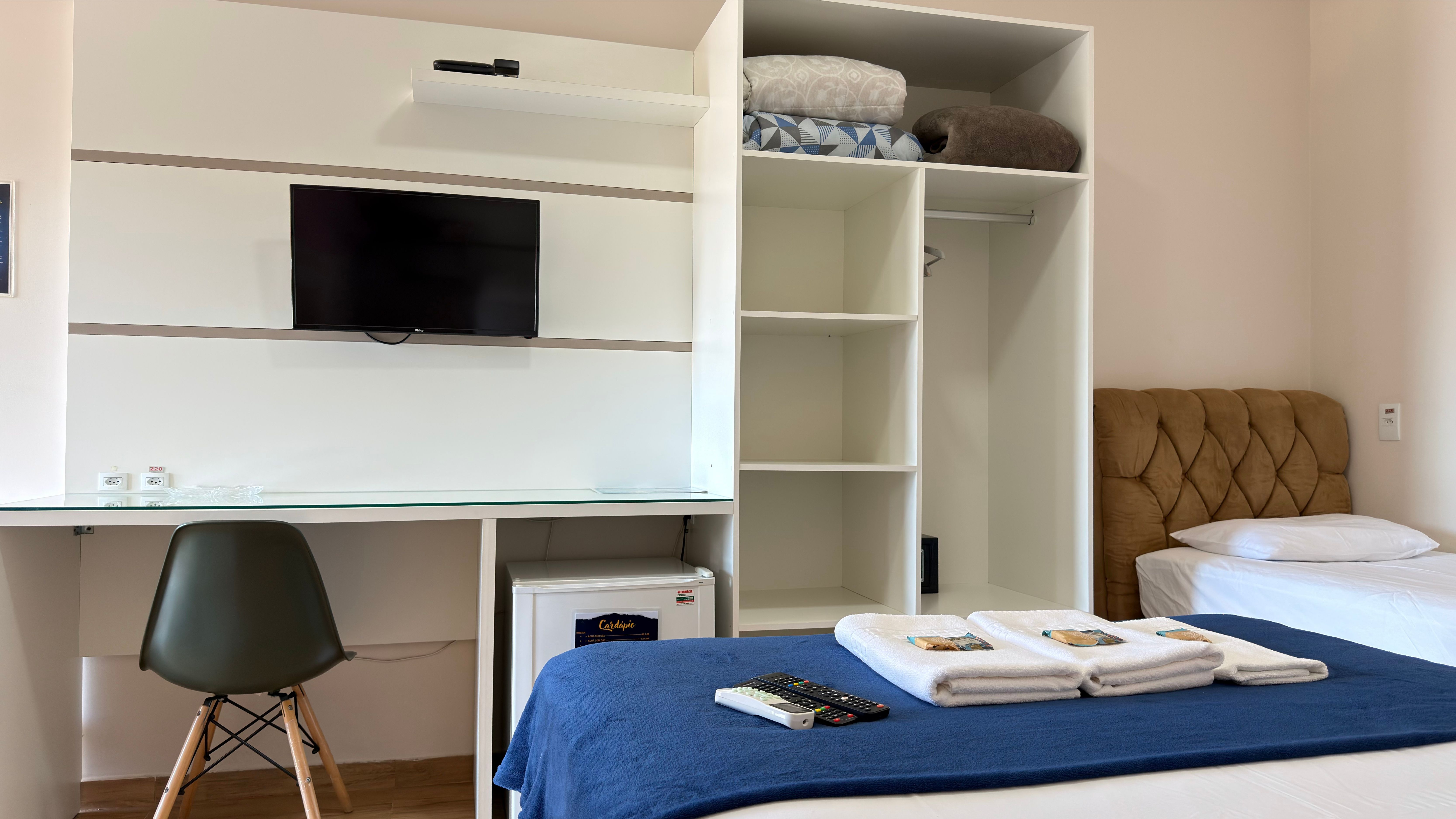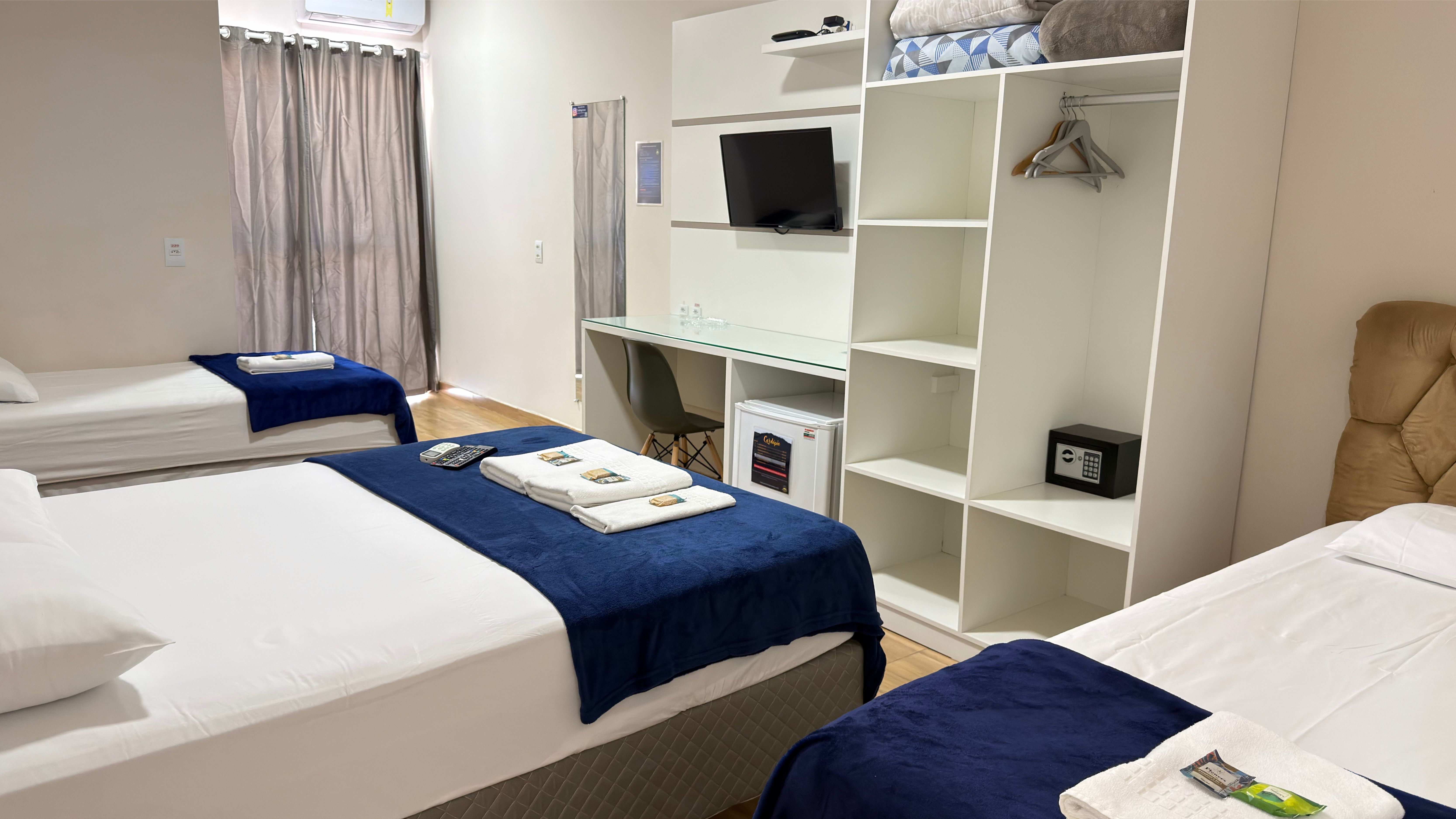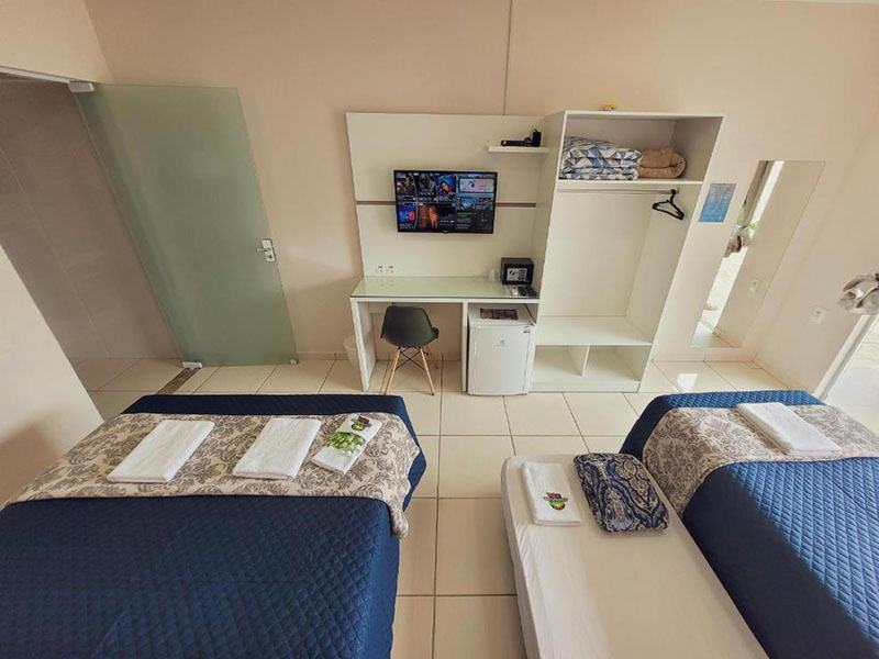 Quarto amplo andar térreo com uma cama casal tamanho padrão e uma cama de solteiro com auxiliar. O quarto também é equipado com Ar Condicionado split frio, frigobar, TV 32 polegadas com (Canais abertos), secador de cabelos, cofre, bancada com cadeira, roupeiro com cabines e banheiro privativo. Perfeito para acomodar sua família com conforto e comodidade.