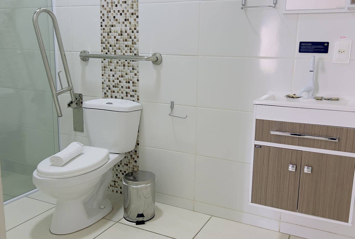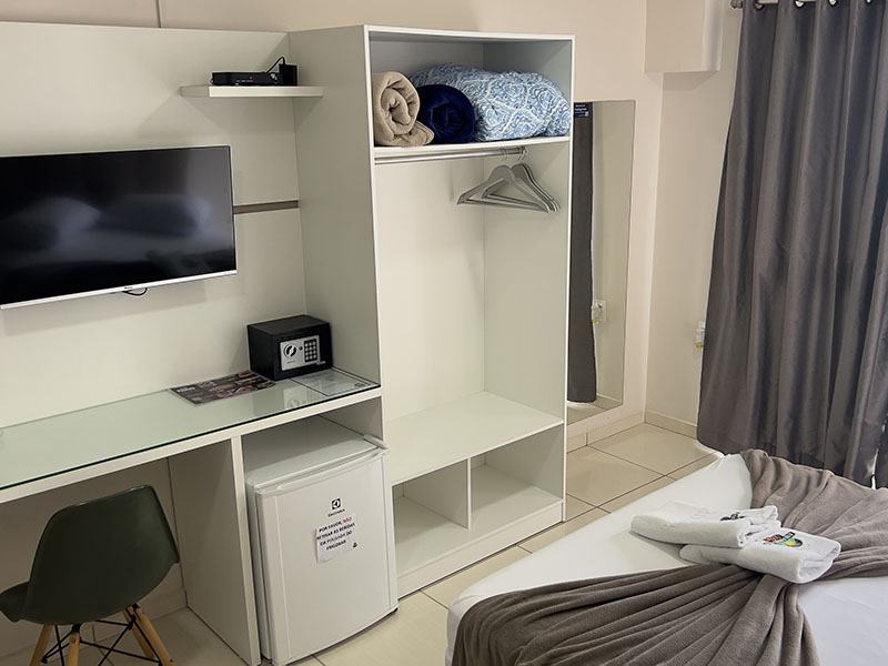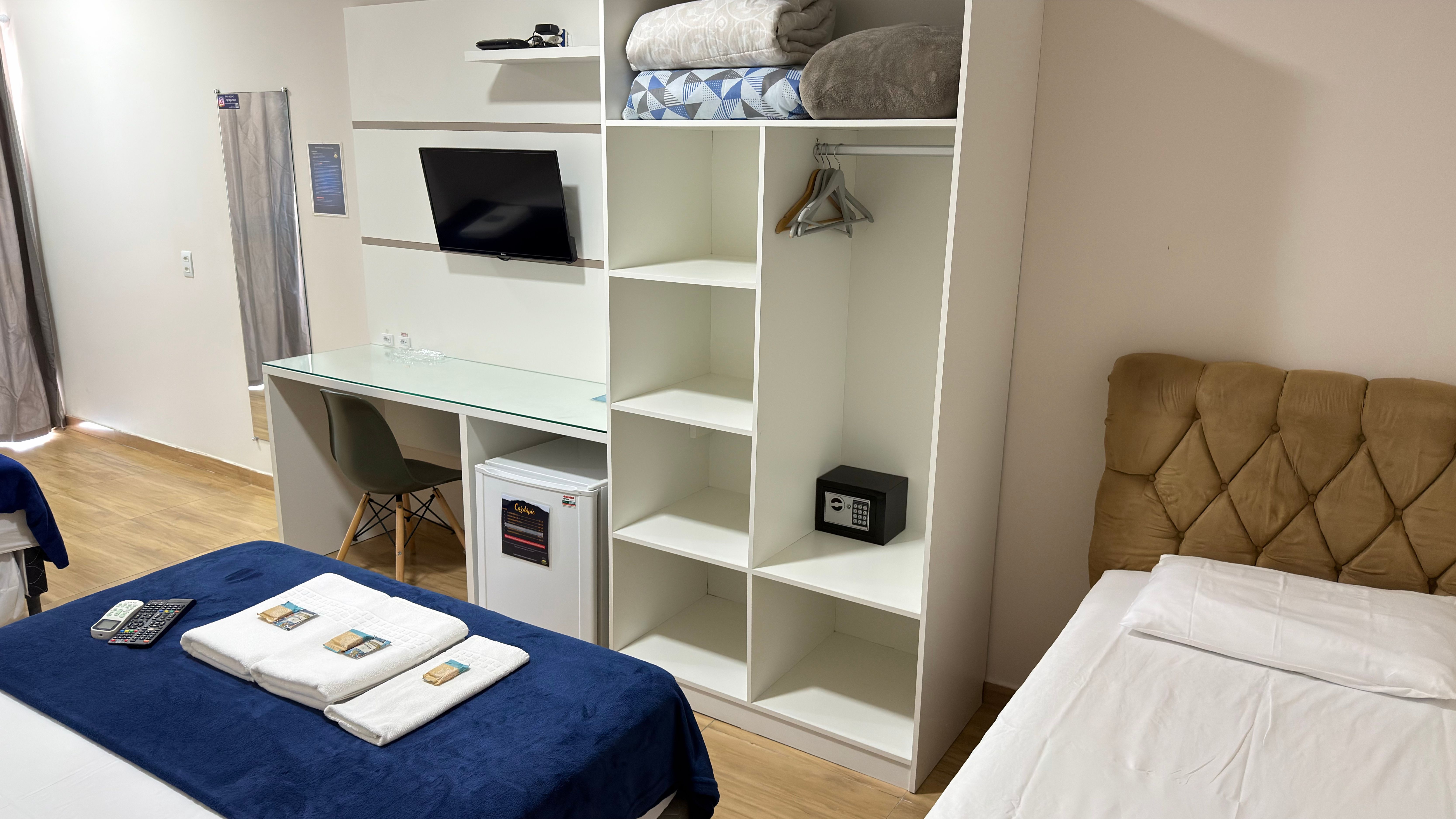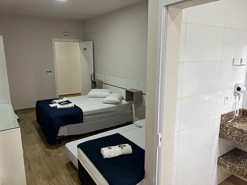 Quarto amplo andar térreo com uma cama casal tamanho padrão e uma cama de solteiro com auxiliar. O quarto também é equipado com Ar Condicionado split frio, frigobar, TV 32 polegadas com (Canais abertos), secador de cabelos, cofre, bancada com cadeira, roupeiro com cabines e banheiro privativo. Perfeito para acomodar sua família com conforto e comodidade.