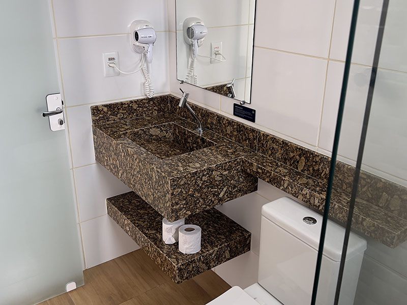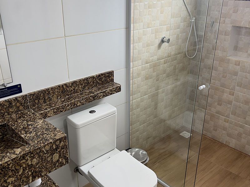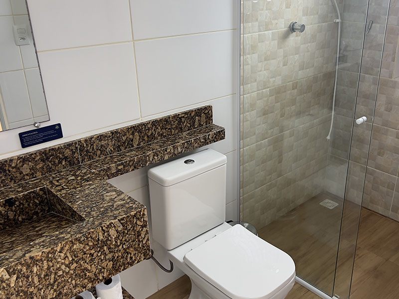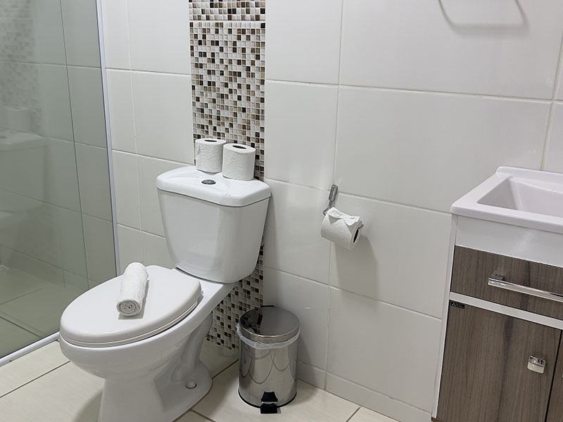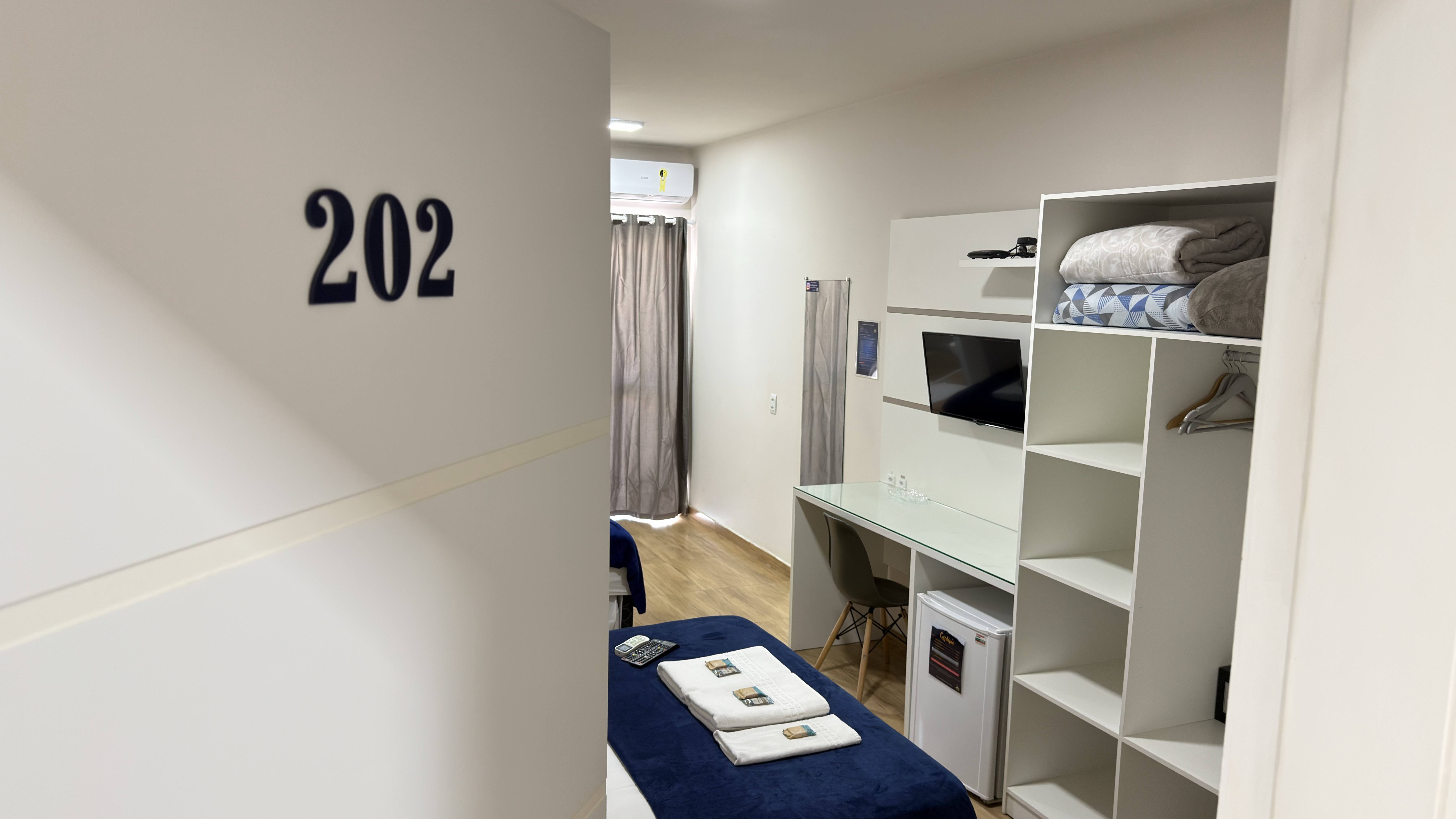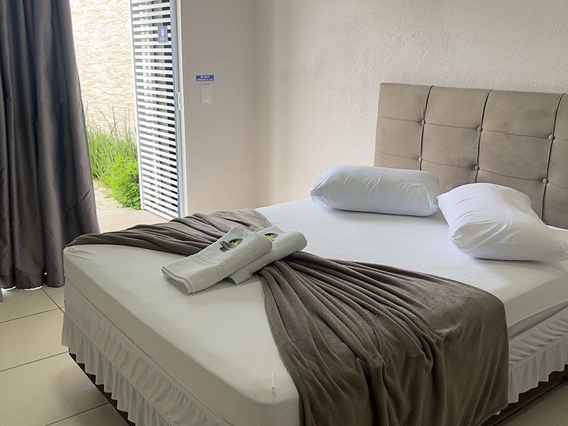 Quarto amplo, andar superior com sacada, equipado com uma cama de casal tamanho padrão e uma cama de solteiro com auxiliar. O quarto também é equipado com Ar Condicionado split frio, frigobar, TV 32 polegadas com (Canais abertos), secador de cabelos, cofre, bancada com cadeira e roupeiro com cabines. Perfeito para acomodar sua família com conforto e comodidade.
