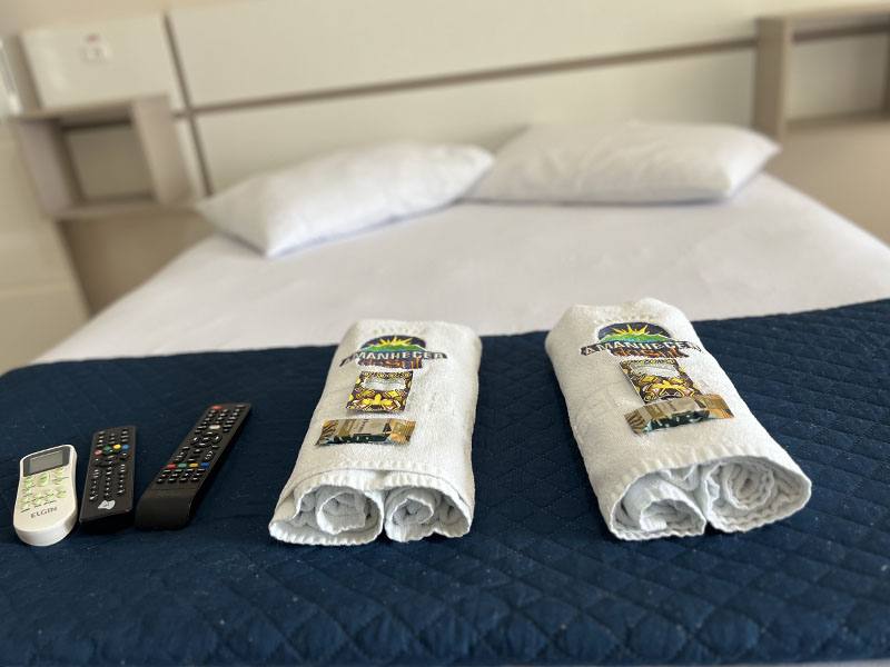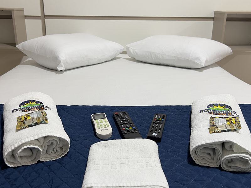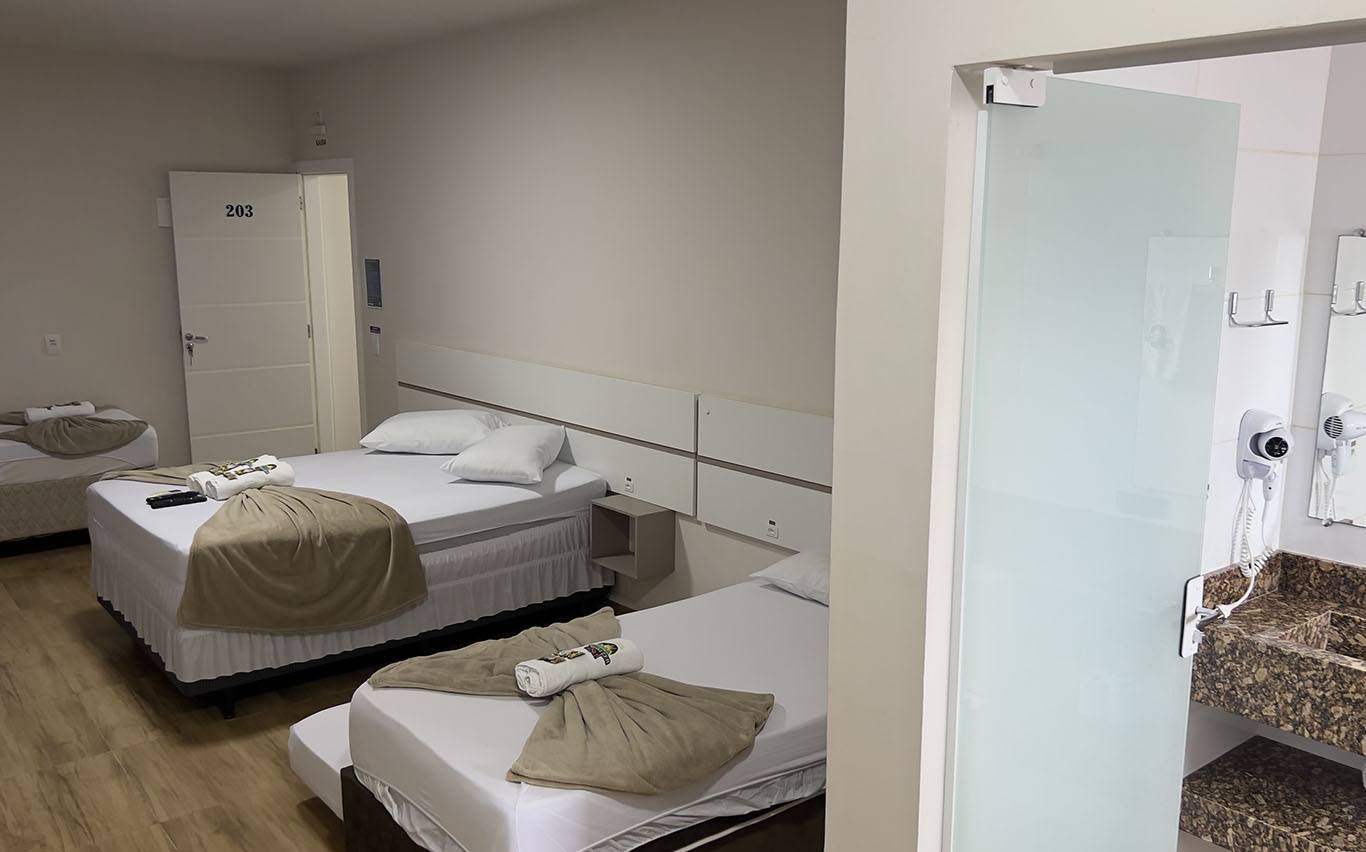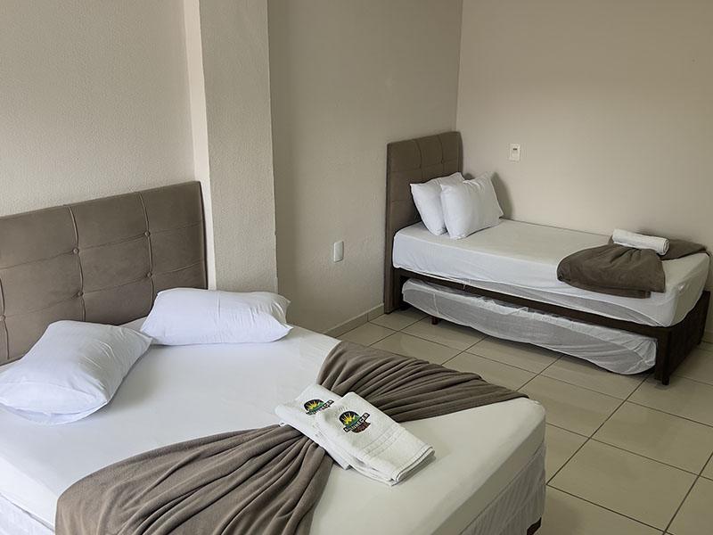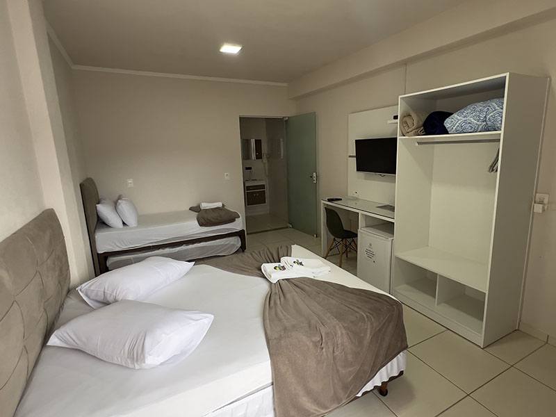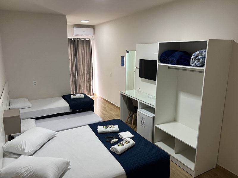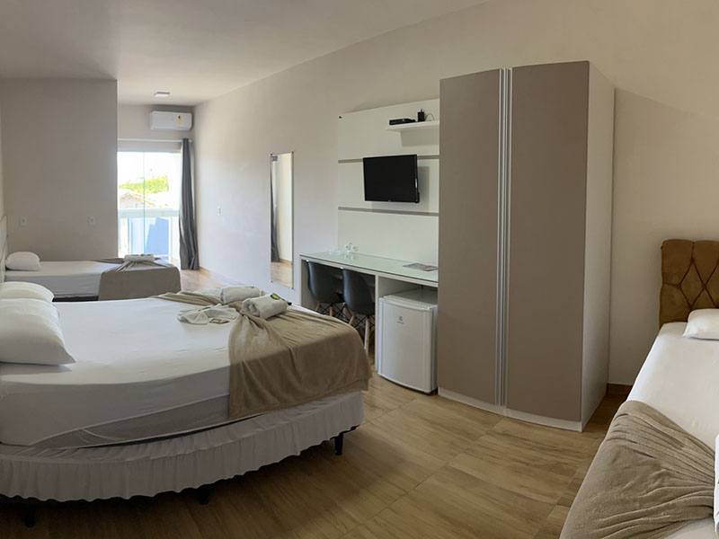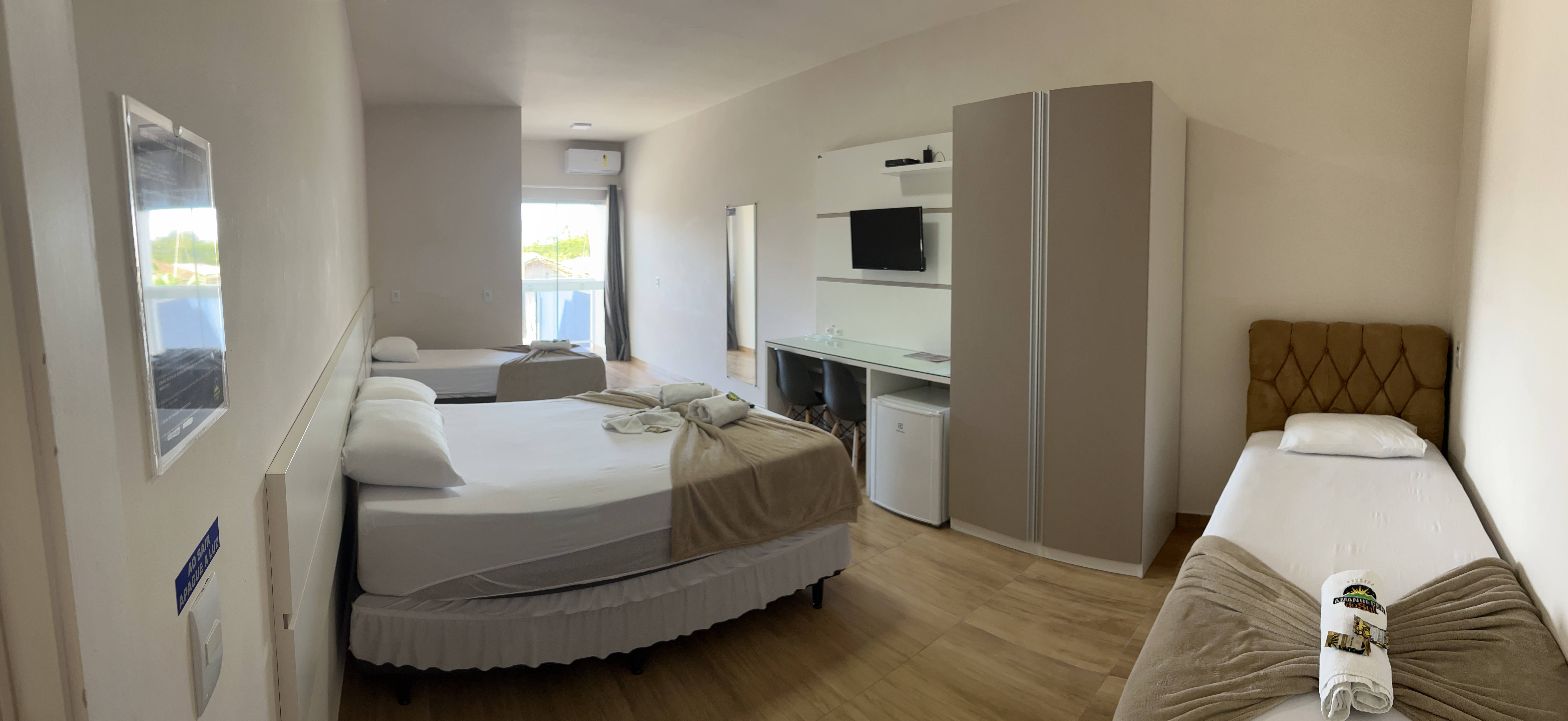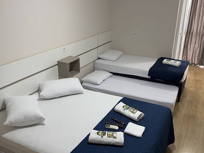 Quarto amplo, andar superior com sacada, equipado com uma cama de casal tamanho padrão, duas camas de solteiro, e uma cama auxiliar. O quarto também é equipado com Ar Condicionado split frio, frigobar, TV 32 polegadas com (Canais abertos), secador de cabelos, cofre, bancada com cadeira e roupeiro com cabines. Perfeito para acomodar sua família com conforto e comodidade.